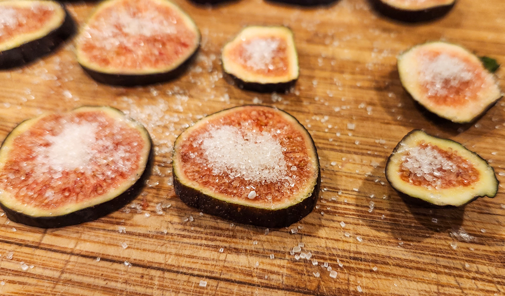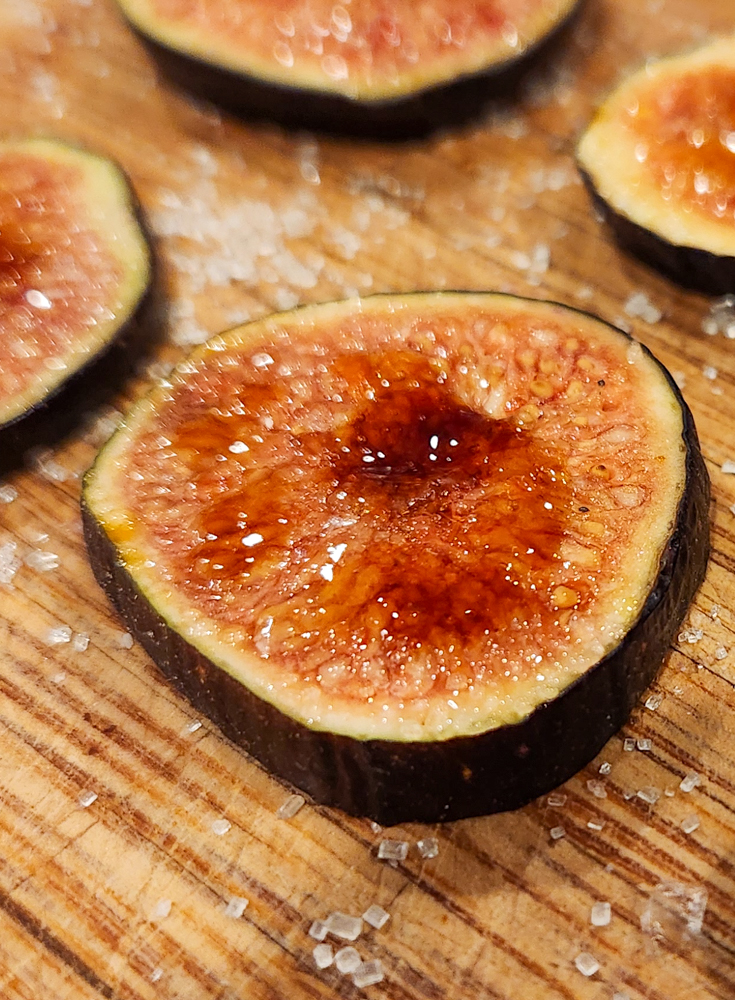 I ended up with the idea to Brulé the figs so I put a few grains of salt, and then a small pile of sugar on each fig slice and hit them with a kitchen torch until the topping was bubbling and beginning to caramelize.