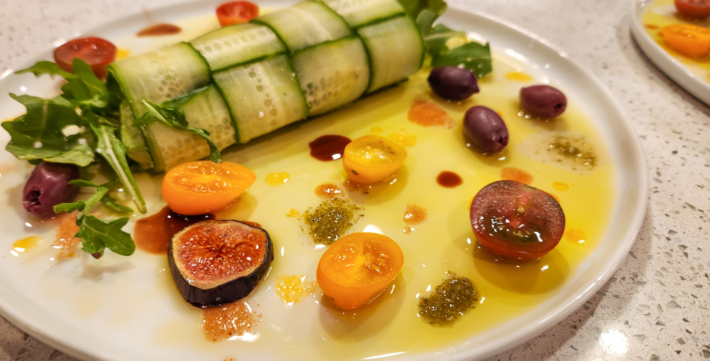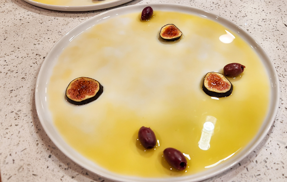 Next I began my plating, by adding all the solid ingredients to the olive oil bottomed plate. I kept them sparse because I wanted plenty of room for the dressings to pool and splatter. I used the figs, kalamata olives and the halved small tomatoes. I left room in a row across the middle of the plate to be able to lay my rolls.