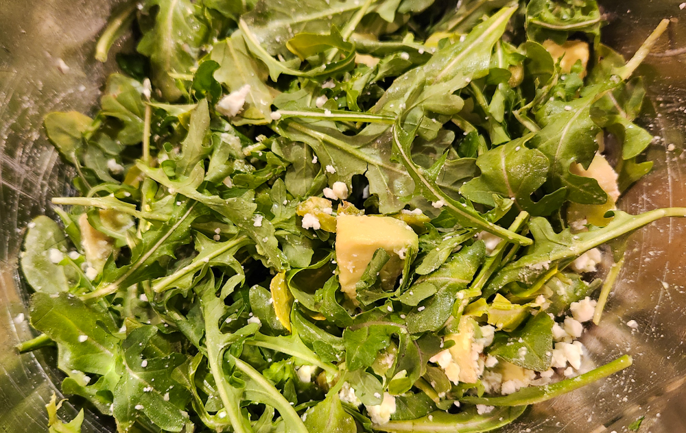 I grabbed my two handfuls or baby Arugula and tossed it in a bowl. I added the crumbled feta cheese and Avocado. I did not add any left over lemon or lime juice that I used to stop the Avocado from discoloring. The reason is the same for why I did not dress the salad directly. I didn’t want the salt or acid to wilt the crisp Arugula over time.