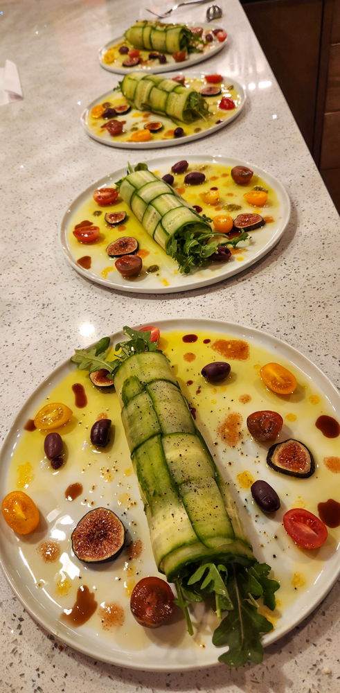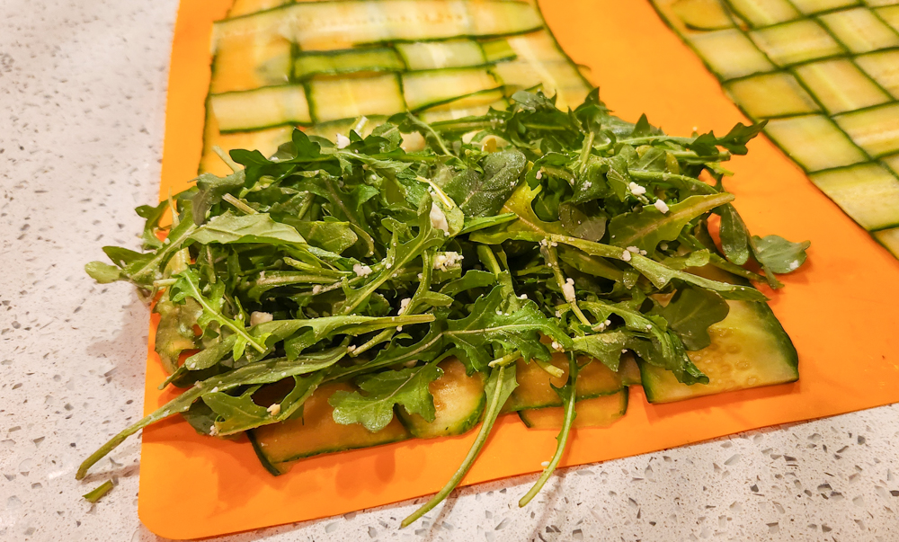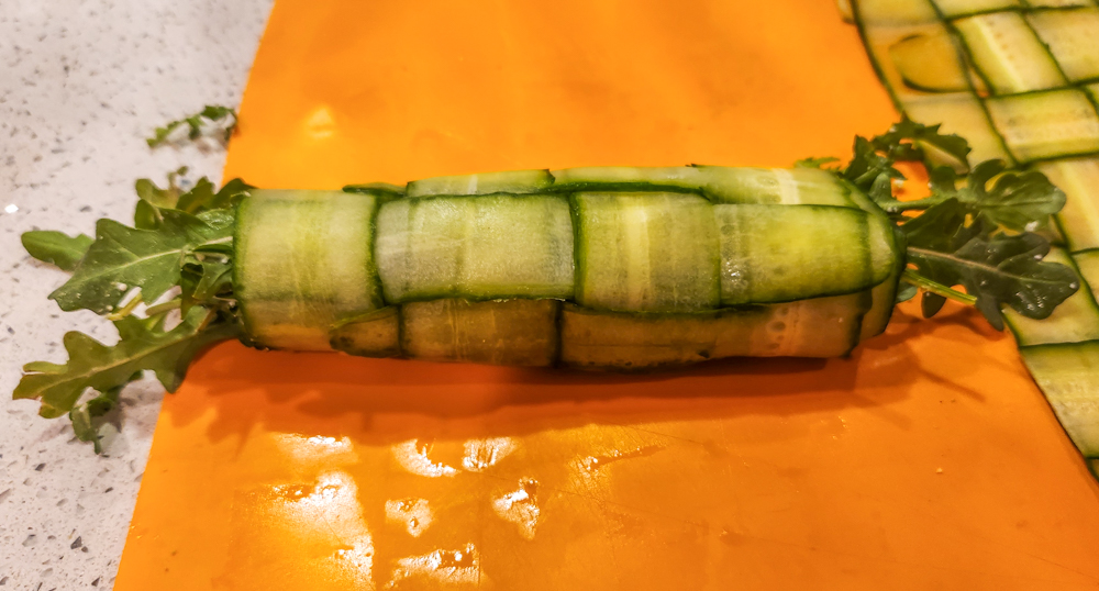 I grabbed about 1/4 or the arugula mixture and placed it on the end of each wrap. I gently lifted to edges of the wrap to make sure I had all the strips. Smushing the greens down I rolled a fairly tight roll about a silver dollar in diameter. The cucumber wrap will overlap a good bit which holds it together. Place them seam side down onto the space left on your plates.