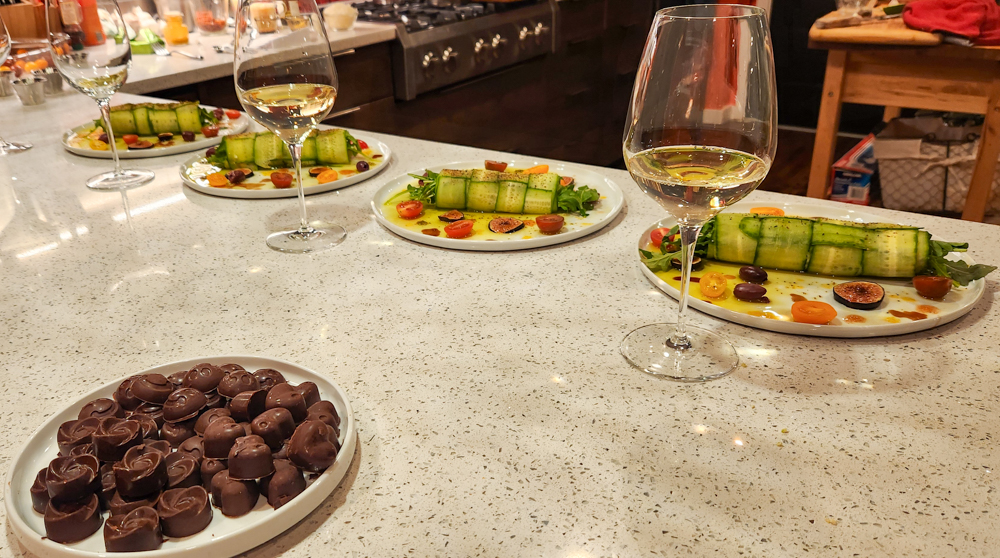 Next I worked on the deconstructed salad dressing. I wanted the guests to ‘create their own’ flavors by being able to dip or while their salad bites in the flavors of their choice. To keep the flavors separate I was not going to do any of that fancy encapsulation or gel stuff. Instead I just spread a thin layer of good quality olive oil onto the bottom of my service plates.