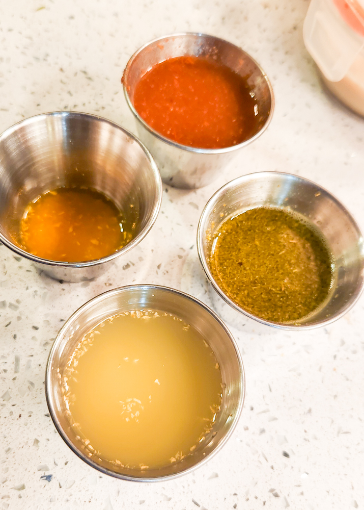 I then began working on my salad vinegars. Each one a different color and flavor profile. I used about 2 Tbsp of vinegar for each one because that is the least amount of volume I can use and the immersion blender still work. Here are the flavors I chose, but be creative and cater to your own tastes.