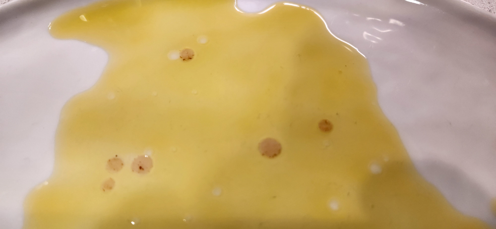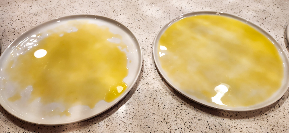 These are large and it took about 2 Tbsp per plate. If that seems like a lot, remember they will not / do not have to eat it all. They will dip or wipe each bite into the sections they want. The surface tension on the oil however does keep the vinegar based flavorings in their own little puddles. You can scatter them, and make them as large or small as you wish. I did try to enhance some colors for presentation and so my guests could tell them apart.