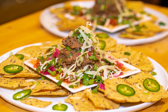 Necessity invented this replacement for the traditional variety made from pinto beans. They are delicious with a southern American twang. Pictured here as a bean dip with nachos.