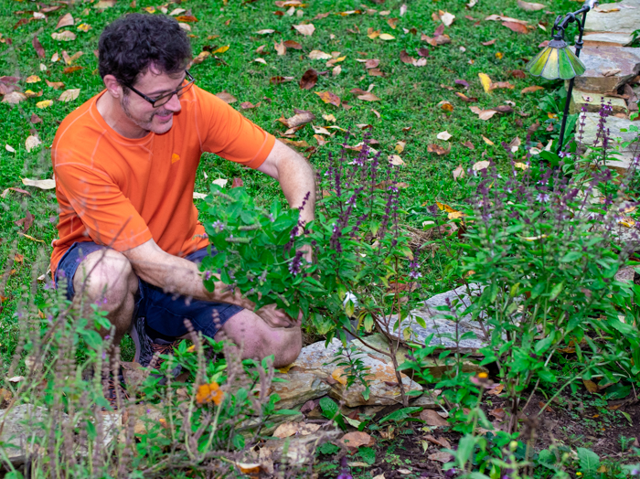 Here is Kerry out harvesting the basil for tonight’s meal. It takes a lot so we have several plants to harvest from so we don’t take too much. All the flavors in Thai basil dishes are bold so even though it seems like 2 cups per person would be too much it’s a perfect compliment in my book. Plus, it’s kinda like spinach… you start with a giant bowl, but once it cooks a bit you’re left with almost nothing.