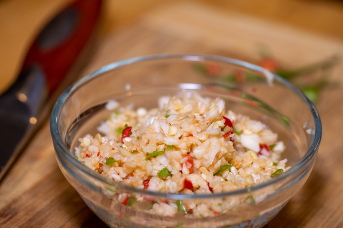 For the garlic and peppers, I simply through them all into either the small cup on my food processor or use my small food grinder to do a fine chop or dice.