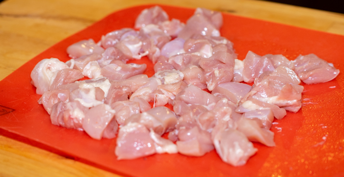 Chop the chicken thighs into bit sized pieces. The smaller you make them the quicker they will cook in the skillet or wok.
