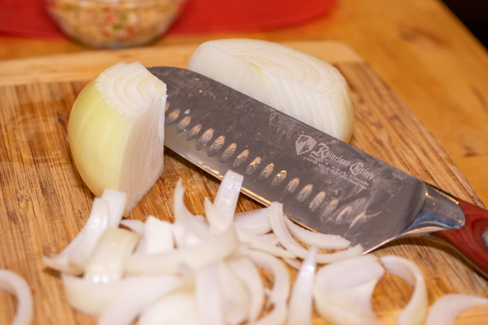Slice your onions. I choose strips for this dish. Cut off the ends of the onion. Set the onion on one of the cut ends and cut it in half. Then cut strips working around each half-moon of the onion.