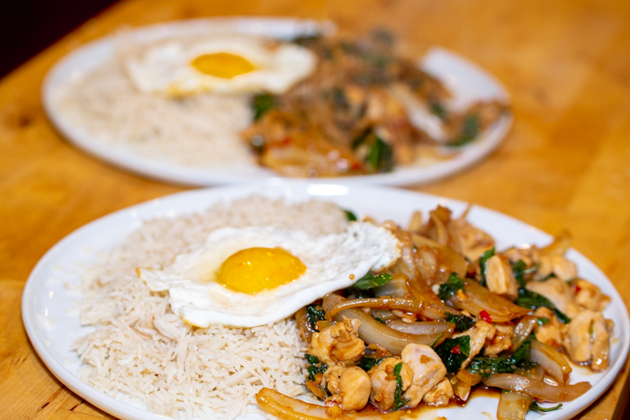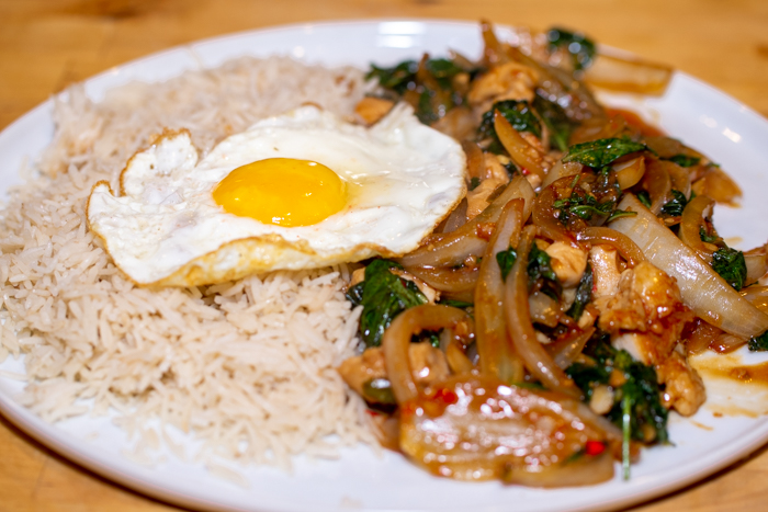 I love the authentic feel of a fried egg with this dish. Plus, if you can handle runny yolks, the smooth richness of the yolk really combines well with the spicy vibrant flavors of Thai Basil Chicken.